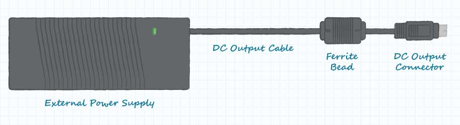 外部電源中的DC輸出電路使用內(nèi)部并聯(lián)電容器來衰減電源輸出上的AC信號(hào)。一些電路設(shè)計(jì)可能還包括串聯(lián)電感器,以提供AC信號(hào)的附加衰減。但是,在最終的輻射測試中,可能會(huì)發(fā)現(xiàn)內(nèi)部過濾不足以滿足EMI的法規(guī)要求。直流輸出電纜不進(jìn)行傳導(dǎo)發(fā)射,但可以用作輻射發(fā)射的合理天線。解決過度輻射問題的一種解決方案是在直流輸出電纜上增加一個(gè)外部鐵氧體磁珠,以使電源符合要求。用于EMI濾波的鐵氧體磁珠旨在提供感抗和阻抗。無功阻抗有助于阻止不良信號(hào)的傳播,而電阻性阻抗會(huì)耗散一些與不良信號(hào)相關(guān)的能量。磁珠的選擇應(yīng)使其物理上適合直流輸出電纜,并在相關(guān)頻率下提供必要的濾波特性。