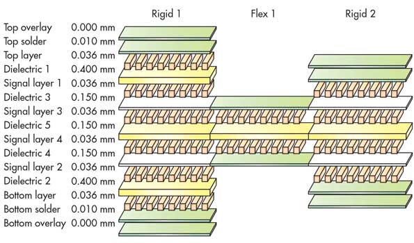 圖2.該板定義了13個(gè)層,其中包括兩個(gè)剛性層和一個(gè)柔性層。