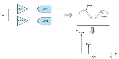 與偏移失配,沒有信號要看到的固有直流兩個(gè)ADC的偏移量。對于增益失配,除非存在信號并且可以測量增益失配,否則無法看到增益失配。的增益失配將導(dǎo)致在的有關(guān)的輸出譜的正 的輸入頻率,如良好的采樣率,以及將出現(xiàn)在 ?F 小號 / 2±?F IN。